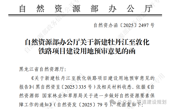 2025/11/0310月30日,自然资源部办公厅印发《关于新建牡丹江至敦化铁路项目建设用地预审意见的函》,牡敦高铁黑龙江段用地预审正式获国家批复,为项目可研批复奠定了基础。根据意见函:“新建牡丹至敦化铁路项目(项目代码:24...