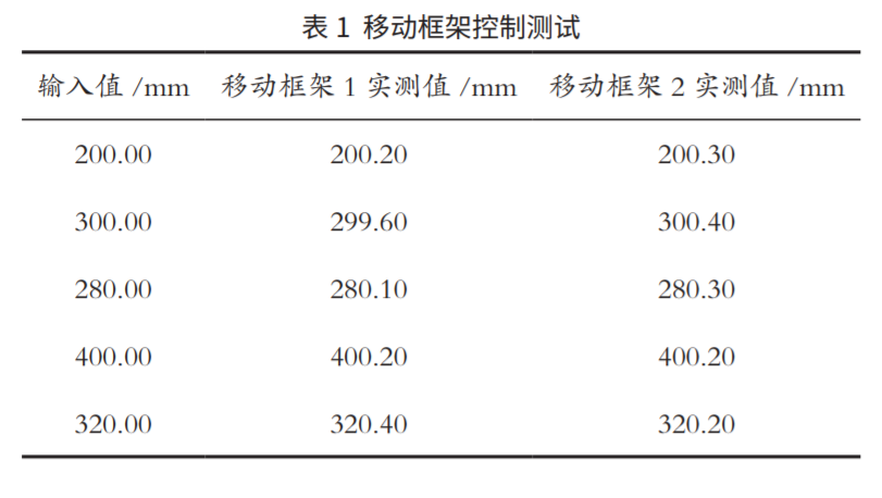为保证检测装置的安全性,需验证对移动框架控制的稳定性。 对移动框架控制的稳定性测试 : 两框架同步运动,步骤如下 :将两移动框架与固定 框架贴合并标记为零点,再手动将两移动框架都调整到 与固定框架横向距离 100 mm 处,软件中同步运动框输 入两框架的位移量(与零点的距离)依次为 200 mm、 300 mm、280 mm、400 mm、320 mm,每次输入后 都测量其实际位移量,再将实际位移量与输入位移量比 较,如表 1 所示。